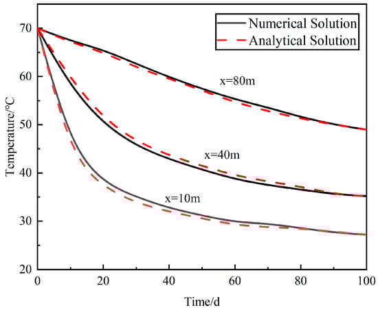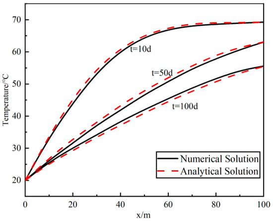 Comparing the numerical and analytical solutions, Figure 4 shows the temperature change along the fracture at three different locations (x = 10 m, 40 m, 80 m), while Figure 5 shows the temperature along the fracture at different times (t = 10 d, 50 d, 100 d). It can be seen that the analytical solution and the numerical solution curves are almost in agreement, except for minor deviations. Therefore, the accuracy and rationality of the numerical method adopted in this study were validated.