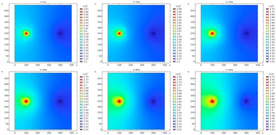 For geothermal development, constant pressure production is used in production wells. It can be seen, from Figure 6, that the rapid decline of heat storage pressure caused by production activities is particularly prominent in the vicinity of production wells. In the process of geothermal exploitation, the thermal reservoir pressure around the production well decreases. Due to the continuous injection of fluid, the thermal reservoir pressure near the injection well is supplemented, to a certain extent, such that the pressure drop near the injection well occurs relatively slowly. During the period from 0 to 30 years, the recovery effect of heat storage pressure caused by injection was not significant. However, after 40 years of geothermal development, the pressure in the thermal reservoir effectively recovered under the same injection pressure conditions. The slow recovery of thermal storage pressure in the early stage of development is closely related to the temperature difference in the vicinity of the injection–production well in the early stage of development. As shown in Figure 7, the temperature in this area is relatively low due to the continuous injection of cryogenic fluids into the area near the injection well, creating a large temperature difference in the area near the production well. Combined with Figure 1a, it can be seen that the dynamic viscosity of water is greatly affected by temperature. In this case, the fluid flow velocity near the production well is much greater than that in the vicinity of the injection area; therefore, in the early stages of development, the pressure drop caused by production significantly exceeds the pressure recovery due to injection [].