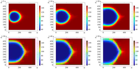 In addition, as geothermal development progresses, the low−temperature area near the injection well gradually expands. After 40 years of thermal development, the temperature difference in the vicinity of the injection and production wells gradually decreases. The variability of fluid flow also decreases, at which point the heat storage pressure begins to be effectively restored. As can be seen from Figure 7, the cold front near the injection well between 0 and 5 years uniformly expands, while the cold front is no longer uniform between 5 and 50 years. The cold front tip appears, which is connected to the open hole part of the production well. It can be seen from Figure 7 that between 0 and 5 years, the low−temperature region is small, and there is no cold front tip. The heat transfer temperature of the cryogenic fluid flows out of the low−temperature region and quickly rises to the heat storage temperature through the pores. It is considered that there is no thermal breakthrough at this stage. The high−pressure gradient near the production open hole causes a large amount of cryogenic fluid to collect and flow to the production open hole, such that the heat in the area near the open hole is extracted first, causing the cold front tip to appear [].