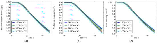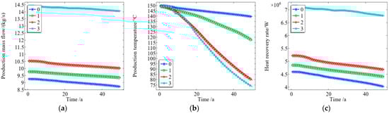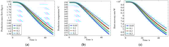 As shown in Figure 8a, with an increase in the permeability of the thermal reservoir matrix, the mass flow rate of the production fluid increases to varying degrees; therefore, an increase in permeability of the thermal reservoir matrix will increase the mass flow rate of the production fluid. When the system reaches a steady state, the mass flow rate of the thermal reservoir fluid with a permeability of 0.455 mD is 1 kg/s. Meanwhile, the mass flow rate of the thermal reservoir with a permeability of 455 mD reached 55 kg/s. From Figure 8b, it can be seen that the higher the permeability of the thermal storage matrix, the faster the temperature of the production fluid decreases, thereby shortening the service life of the thermal storage system. Within 40 years of development, the system with a matrix permeability of 91 mD decreased from 150 °C to 138 °C, while the system with a permeability of 455 mD only took 17 years to achieve the same temperature drop. From Figure 8c, it can be seen that, when the matrix permeability is 455 mD, the heat recovery rate decreases the fastest. However, as the system continues to operate, the gap between the heat extraction rates corresponding to different permeability gradually narrows; that is, the influence of permeability on the heat extraction rate gradually weakens. This is because, although the production well flow increases with the increase in permeability, the heat loss of the reservoir will also increase at the same time, resulting in the enthalpy difference between the production well flow and the injection well flow becoming smaller. Therefore, at the same time, the production mass flow will increase with an increase in permeability while the enthalpy difference will decrease. Therefore, with the continued operation of the system, the influence of permeability change on the heat extraction rate becomes smaller and smaller; the sensitivity of the heat extraction rate to permeability increases with an increase in permeability and decreases with a decrease in permeability, where this change is very significant.