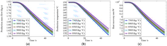 As shown in Figure 11, when the specific heat capacity of the heat storage matrix increased from 750 J/(kg·°C) to 950 J/(kg·°C), the mass flow rate of the production fluid of the system increased by 2.5%, the temperature of the production fluid increased by 2.14%, and the heat recovery rate increased by 5.5%. This is because a greater specific heat capacity of the reservoir matrix leads to more heat being released by the reservoir to reduce the unit temperature, with a higher increase in the fluid temperature. The higher the temperature of the fluid in the thermal reservoir, the stronger the fluidity, the greater the mass flow rate of the production fluid, the higher the temperature of the production fluid, the longer the development life of the thermal reservoir, and the greater the heat recovery rate.