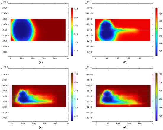 Spatiotemporal distribution of temperature evolution during geothermal development. (a) No fractures; (b) one fracture; (c) three fractures; (d) five fractures.