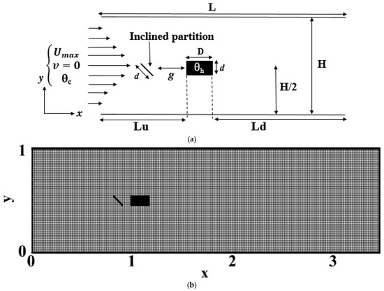 Figure 1a depicts the configuration of the computational domain. Cold air flows around a rectangular block of dimension () which is located in a two-dimensional channel. The block is located at an upstream distance of and at a downstream distance , with a blockage ratio of . An inclined partition, of length and height , is placed upstream of the block. The spacing between the partition and the cylinder is noted as g.