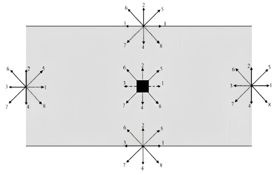 Figure 3b illustrates the numerical scheme of the model used when the particles of fluid move from one node to another adjacent node of the grille with discrete velocities (), which are defined by the following: