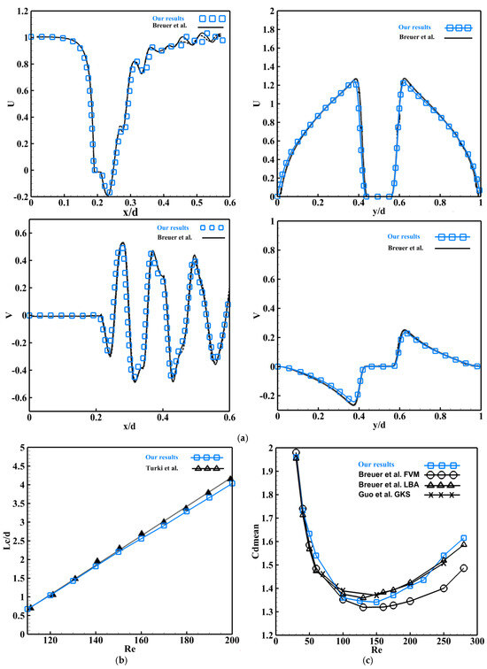 Comparison of the validation results: (a) U and V velocity profiles along the x and y axes at and , respectively, for Re = 100, compared with [28]; (b) recirculation length as a function of Re, compared with [9]; (c) average drag coefficient values as a function of Re, compared with [28,29].