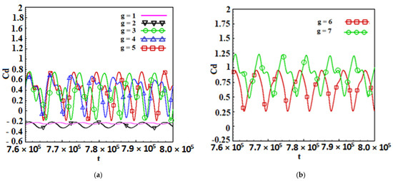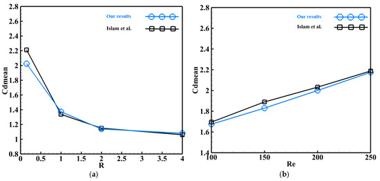 Average drag coefficient comparison with the existing literature data [30]: (a) variation as a function of the ratio ; (b) variation as a function of the Reynolds number .
