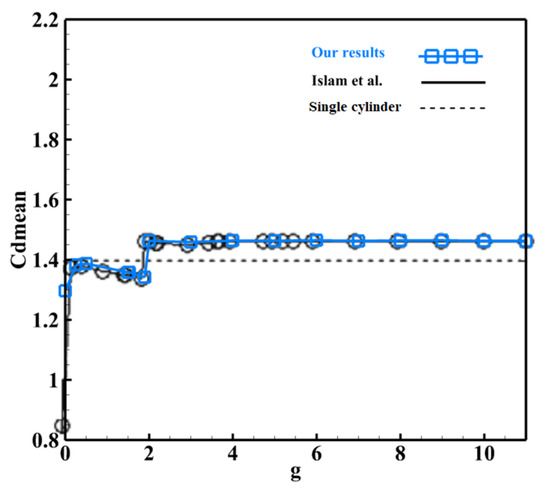 A further validation study was added to ensure the quality and precision of our numerical code. In this investigation, the simulation of the flow of a fluid around a square cylinder controlled by an inclined partition at a blocking ratio was performed and validated with the results found by Islam [8]. Figure 6 presents the variation in the average drag coefficient as a function of the distance separating the square obstacle and the control partition at a fixed Reynolds number ().