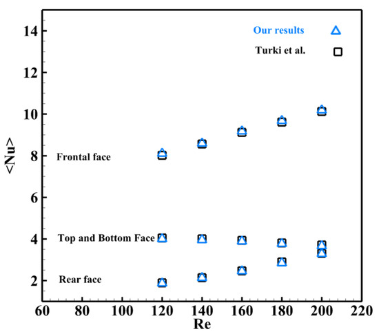 Figure 7 illustrates the mean Nusselt number variations as a function of the Reynolds number on all faces of the obstacle. The current results are compared with those obtained by Turki et al. [9]. The heat exchange between the fluid and the front face is observed to be more pronounced than that occurring on the other faces. This is due to the direct contact between the fluid particles and this face, whereas this exchange decreases strongly on the rear face due to the recirculations formed behind this face. Also, the following graph illustrates that the obtained results are similar to those of Turki et al. [9].