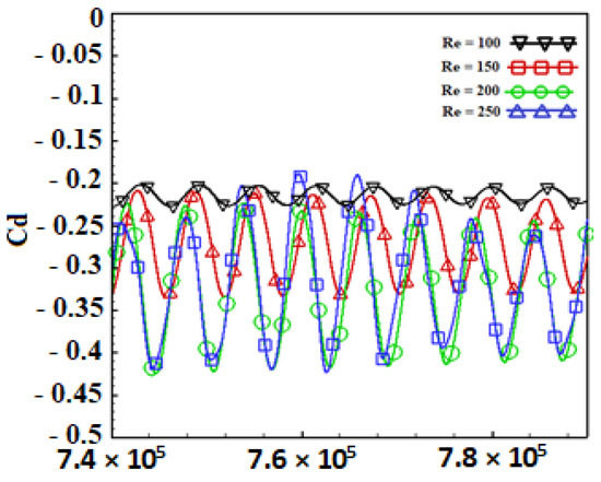 The comparison of the results demonstrates a slight discrepancy (below 1.7%) relative to the numerical findings of Breuer et al. [28], Guo et al. [29] and Turki et al. [9]. This difference is generally due to the grid used. Indeed, the length of the recirculations formed behind the obstacle increases with increasing Reynolds numbers. The average values of the drag coefficient exhibit a decreasing trend with increasing Reynolds numbers until reaching a minimum, after which a subsequent increase is observed. This is due to the fact that for low Reynolds numbers, viscosity effects are more intense than inertia effects. As the Reynolds number increases, so does the velocity of the fluid particles. Consequently, the generation of vortices behind the obstacle increases. As a result, the average values of the drag coefficient increase.