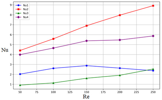 To validate the accuracy of the present numerical code for the thermal problem, a comparative study was conducted by analyzing the Nusselt number against reference data from the literature [31]. As shown in Table 1, the average Nusselt number was evaluated for each face of the cylinder, with a particular focus on the maximum deviation at a low Reynolds number. The results demonstrate strong agreement with the reference values reported in [31], confirming the reliability of the numerical approach.