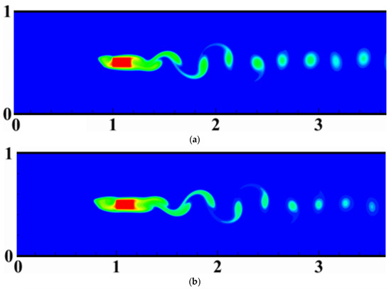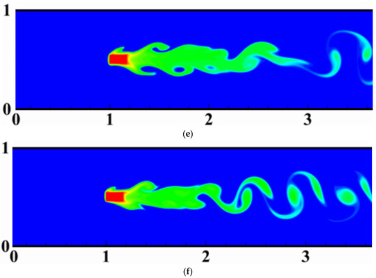 Figure 4a–c show, respectively, the velocity profiles along the x and y axes, the variation in the recirculation length behind the square obstacle as a function of the Reynolds number, and the variation in the average drag coefficient for different values of the Reynolds number varying between and . It should be noted that the finite volume and lattice Boltzmann methods used by Breuer et al. [28] are applied to non-uniform () and uniform () grids, respectively, whereas the results of Guo et al. [29] are obtained using the gas kinetics scheme (GKS) with a () grid.