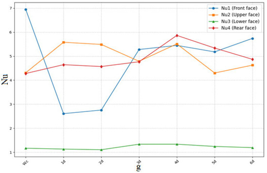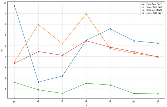 In the absence of a partition (), the front face () experiences maximum heat exchange due to the direct impact of the airflow. However, when the partition is placed at , drops significantly, which can be attributed to the thermal shadow effect induced by the partition’s close proximity. From onward, progressively increases, reflecting an improvement in heat exchange as the spacing allows for a more favorable development of airflow. Nevertheless, at the critical spacing , remains lower than in the uncontrolled case, indicating a persistent attenuation of heat transfer on this face due to the partition’s influence. The upper face () exhibits a substantial peak at , likely due to optimal interaction between the airflow deflected by the partition and the upper wall, leading to enhanced convection. At , this effect is even more pronounced, with increasing by , demonstrating a near doubling of heat transfer on this surface compared to the reference case. However, for larger spacings (), a gradual decrease is observed as the partition’s influence weakens. The rear face () is minimally affected by variations in g as it remains within a stable wake flow regime that is inherently unfavorable to heat transfer. At , a slight decline of is noted, suggesting that modifications in the wake vortex dynamics do not significantly enhance convection in this region. Finally, the lower face () follows a trend similar to that of , but with slightly lower values. At g = 3d, experiences a increase, indicating a significant enhancement of convective heat transfer due to improved airflow interaction with the lower wall. However, convection remains less effective in this region compared to the top face, likely due to the partition’s inclination, which influences the airflow reaching it.