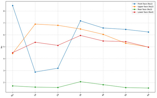 The graph in Figure 16 illustrates the evolution of the average Nusselt number for each face of the rectangular cylinder (front, top, rear, and bottom) as a function of the upstream spacing g for a Reynolds number fixed at . Case Wc, corresponding to the absence of the control partition, is used as a reference. In the Wc case, reaches a maximum value of around 10. When the partition is introduced, a sharp drop in is observed for , followed by a gradual rise for higher spacings (). peaks at , then decreases steadily as g increases. displays low, relatively constant values. Finally, follows a trend close to that of , but with overall lower values.