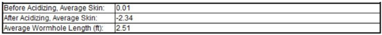 Table 1 offer a detailed overview of the important parameters controlling the performance of the emulsified acid system. The ideal acid-to-diesel ratio was determined to be 70:30, which ensures consistent emulsion formation while successfully limiting acid discharge for deep reservoir penetration. The emulsifier concentration, ranging from 3 to 5 wt%, was critical in maintaining the stability of the two-phase emulsion, especially under high-temperature conditions of up to 275 °F, which are typical of deep carbonate reservoirs. Reaction retardation was well controlled, allowing for longer acid–rock interaction, resulting in deeper wormhole propagation and increased acid penetration efficiency. The formulated system had a major advantage in that it greatly reduced corrosion rates when compared to standard hydrochloric acid (HCl) treatments, improving wellbore integrity and minimizing equipment degradation. Furthermore, the injectivity of treated wells increased by 2.5 to 5 times, demonstrating the better stimulating effectiveness of the emulsified acid treatment. These findings show that the improved formulation has the potential to increase well productivity while reducing operational constraints associated with conventional acidizing procedures.