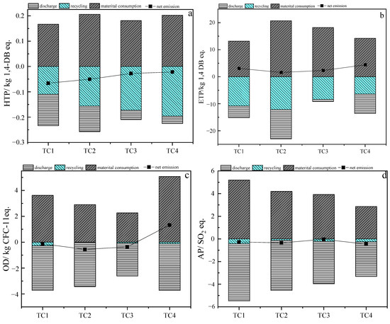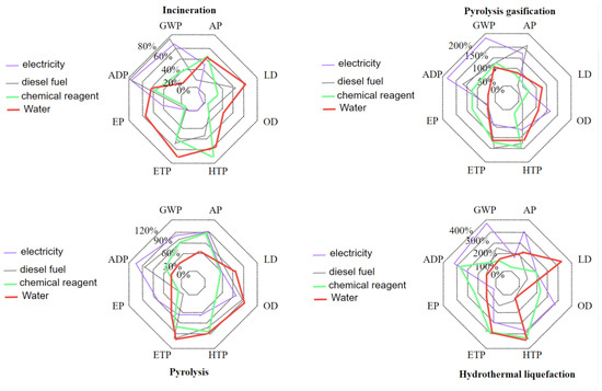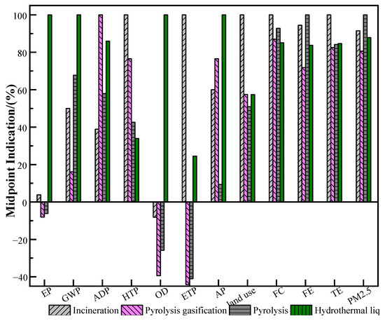 3.1. Analysis of All Midpoint Indicators for the Life Cycle Assessment of Four Processes