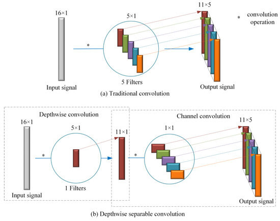 Depthwise separable convolutional neural networks are an efficient variant of traditional CNNs that significantly reduce computational complexity while preserving feature extraction capabilities. Unlike conventional CNNs, which apply a single convolution operation to both spatial and channel dimensions simultaneously [35], DSCNN decomposes this process into two separate steps: depthwise convolution and pointwise convolution. The depthwise convolution operates independently on each input channel, capturing spatial features, while the pointwise convolution (1 × 1 convolution) fuses information across channels. This structure reduces the number of parameters and floating-point operations, making DSCNNs particularly suitable for real-time applications and large-scale data processing. First, a brief introduction to the basic principles of traditional convolutional neural networks. The traditional convolution operation, as shown in Figure 1a, combines spatial convolution and channel convolution. The input variable and convolution kernel parameters can both be represented in matrix form, where denotes the convolution operation, is the bias term, is the activation function, and is output. The processing procedure of the traditional convolutional network can be described by the following equations: