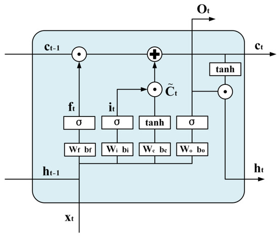 As shown in Figure 2, the LSTM structure includes three control gates: the forget gate, input gate, and output gate. The forget gate calculates the degree of forgetfulness by processing the previous time step’s hidden state and the current time step’s input through a sigmoid unit. The forget gate output is denoted as The calculation formula is as follows: