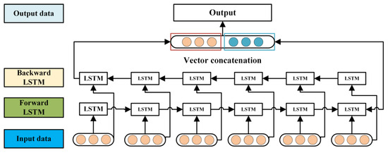 The symbol represents the element-wise multiplication. LSTM can effectively handle the long-range dependency problem in time series data, but it can only capture unidirectional dependencies in the data. To further improve the model’s performance, BiLSTM was introduced. By combining a forward LSTM and a backward LSTM, BiLSTM can better capture both forward and backward dependencies in the data [37]. Specifically, the BiLSTM model consists of two LSTMs: one processes the input sequence from left to right, while the other processes it from right to left. After processing, the outputs from the two LSTMs are concatenated and passed to the next layer of the network. The network structure of BiLSTM is shown in Figure 3. By incorporating the backward LSTM, BiLSTM not only considers information from the past but also utilizes information from future time steps [38]. This can significantly improve the model’s accuracy in many practical applications, especially when the data exhibits strong temporal dependencies or periodicity. Like LSTM, BiLSTM also uses three gating structures, which help enhance the model’s ability to learn and represent time series data.