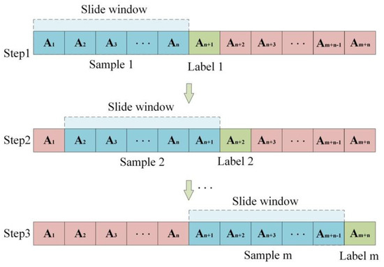 After data normalization, to effectively prepare the dataset for model training, this study further divides the data using a time-window-based sampling strategy. As illustrated in Figure 5, we applied a sliding window approach to transform the original time series data into training samples and corresponding labels. This strategy splits the original time series into multiple fixed-length samples, with each sample corresponding to a prediction label at a specific time step. The steps are as follows: