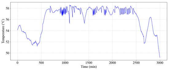 In this section, operational data from the motor and gearbox of a wind turbine at a wind farm in Shaanxi, China, were collected for experimental validation to assess the performance of the proposed model in real-world applications. To ensure the reliability and representativeness of the experimental results, temperature data were recorded at 60 s intervals, with each data collection consisting of 3000 time points. Figure 6 and Figure 7 display the temperature data for the motor and gearbox, respectively. The temperature was measured using industrial-grade thermocouples installed at the generator bearings and gearbox housing, ensuring accurate and consistent readings. The collected data were directly obtained from the wind farm’s Supervisory Control and Data Acquisition (SCADA) system, which continuously monitors the turbine’s operational status.