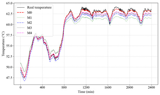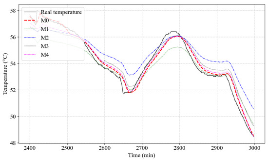 From the data in Table 2, it is evident that the proposed model, M0, significantly outperforms the comparative models in terms of prediction accuracy. While the prediction errors of the comparative models are relatively small, they exhibit lower sensitivity to large temperature fluctuations, and their overall prediction accuracy is inferior to that of M0, with larger errors in localized regions. In contrast, the proposed model, M0, not only demonstrates smaller overall errors but also shows superior precision in localized regions and a better ability to respond to rapid temperature changes. Particularly during phases of rapid temperature fluctuation, M0 effectively captures the details of temperature variations, providing more stable and accurate predictions.