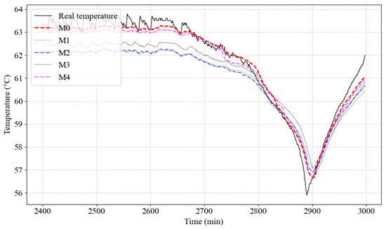 As shown in Figure 9, both the proposed method (M0) and the comparison method (M4) exhibit a high degree of alignment between the predicted temperature curves and the actual temperature curve in the test data, significantly outperforming the other three comparison methods (M1, M2, M3). Throughout the entire test period, both M0 and M4 demonstrate strong predictive performance, particularly during the stable temperature phase (2400–2800 min), where both models closely follow the actual temperature curve with high accuracy. During the rapid temperature drop phase (around 2900 min), M0 and M4 also show superior trend-capturing ability compared to the other methods, with their predicted curves closely aligning with the actual values. In contrast, M1, M2, and M3 exhibit weaker prediction performance across the entire period, especially during phases of rapid temperature change, where their predicted curves deviate significantly from the actual values.