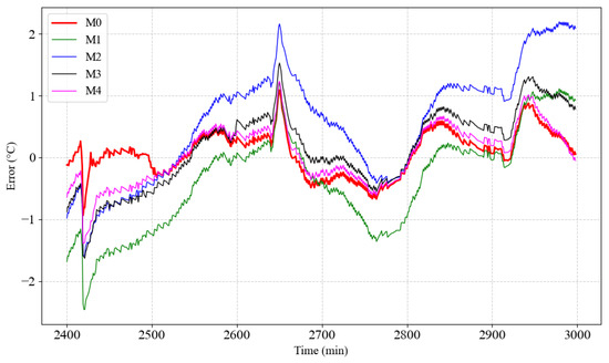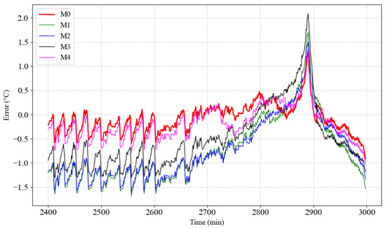 Further analysis of the error curves (Figure 10) reveals that the error range of M0 and M4 stays within ±0.5 °C, with both models demonstrating significantly lower errors than the other three methods across most time periods. Notably, during the stable temperature region (2400–2800 min), although M4 exhibits relatively small errors, M0 maintains more stable errors with smaller fluctuations, indicating that M0 has higher robustness and accuracy when handling complex nonlinear dynamic features. In contrast, the error fluctuation range of M1, M2, and M3 is wider, with errors exceeding 1.5 °C during certain periods. This is especially evident during rapid temperature changes, where the performance of these methods is noticeably insufficient, failing to effectively capture the temperature dynamics. The experimental results strongly validate the superior performance of the proposed method (M0). M0 excels in overall prediction accuracy, robustness, and dynamic feature capture, especially in complex nonlinear scenarios, highlighting its greater potential for practical applications. These findings further demonstrate that the proposed method offers an efficient, accurate, and robust solution for predicting mechanical component temperatures, providing valuable technical support for monitoring industrial equipment’s operating conditions and early fault warning.