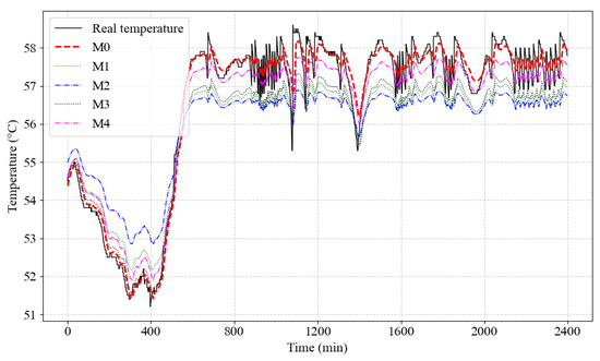From Figure 12 and Figure 13, it can be observed that the proposed model M0 demonstrates significant advantages in the gearbox temperature prediction task. Figure 12 shows the comparison between the predicted temperatures and the actual temperatures for five models. The prediction curve of M0 aligns closely with the actual temperature curve, especially in regions with rapid temperature changes (e.g., the sharp drop around 2700 min and the rapid rise around 2800 min). M0 accurately captures the temperature fluctuation trends, exhibiting outstanding modeling capability and adaptability to complex variations. In contrast, the prediction accuracy of the other models is significantly lower. Particularly during rapid temperature changes, the predicted peaks and troughs of these models generally show delays or deviations. Although M1 can follow temperature changes in some regions, its overall trend-fitting capability is insufficient. M2 and M3 show weaker trend-capturing abilities in regions with complex temperature fluctuations, with large deviations between predicted and actual values. While M4 performs relatively well overall, its prediction accuracy is slightly inferior to M0 in some rapid fluctuation regions, which may be due to its limited ability to suppress noise.