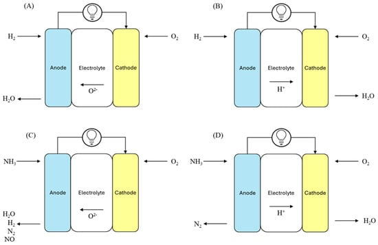 Schematic diagram of direct O-SOFC (left) and H-SOFC (right) when fuelled with hydrogen (A,B) and ammonia (C,D) gas, respectively.