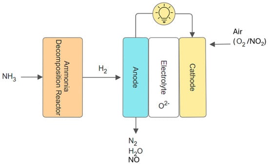 In the context of ammonia being used as a fuel, there are two options for the cracking of ammonia, either externally or internally []. External decomposition consists of the standard anode, electrode, and cathode setup shown in Figure 2, but an ammonia decomposition reactor is placed outside next to the SOFC system. The decomposition reaction would occur in the external reactor, meaning that ammonia would be cracked into nitrogen and hydrogen before being delivered to the SOFC [].