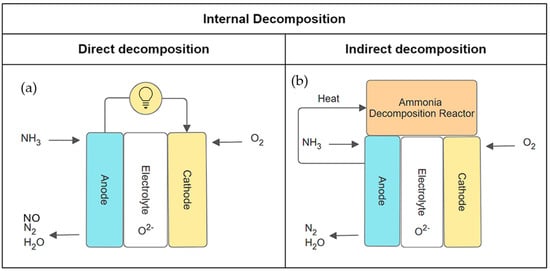 Schematic diagram of ammonia-fuelled O-SOFC. (a) Direct decomposition. (b) Thermally integrated indirect decomposition.