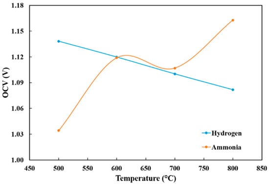 The OCV is seen as a fundamental concept in electrochemistry and is closely tied to thermodynamics; it is related to the Gibbs free energy of the overall reaction. The Nernst equation states that the overall reaction’s Gibbs free energy is equivalent to the maximum electrical work achievable, which defines the OCV. However, the OCV measurement does not reflect the thermodynamic equilibrium, as non-equilibrium phenomena such as corrosion affect the OCV value. Moreover, it is important to note that OCV models should be thermodynamically consistent []. Figure 4 compares the OCV of a SOFC when hydrogen and ammonia fuels are used []. As temperature increases for a cell fuelled with hydrogen, the Nernst factor increases and H2O vapour pressure enhances due to faster kinetics and evaporation, which all lowers the Nernst potential demonstrated in Figure 4. The ammonia decomposition efficiency depends strongly on temperature. At low temperatures (450–600 °C), there is incomplete NH3 decomposition that leads to low H2 yield and residual NH3. Furthermore, the anode gas contains a mix of ammonia, hydrogen, and nitrogen gases, reducing adequate hydrogen partial pressure, which causes OCV fluctuations due to an unstable H2 supply. Ammonia decomposition becomes efficient at higher temperatures (650–850 °C), producing ample H2. Nitrogen gas acts as an inert diluent, which lowers the partial pressure of H2O and shifts the Nernst potential upward, counteracting the temperature-driven decline seen in H2. The Nernst equation, a relation between the OCV and the cell characteristics, is employed to correctly interpret the measured OCV value. In short, the OCV is a crucial parameter that requires a solid grasp of thermodynamics to understand and predict the behaviour of SOFCs.