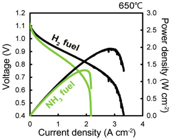 I-V-P curves of the cell fuelled by ammonia (green) and hydrogen (black) at 650 °C. Reproduced with permission from ref. [].