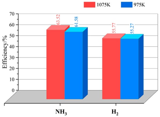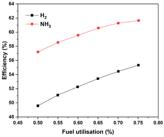 Fuel utilisation in SOFCs depends on numerous factors, such as operating temperature, pressure, fuel composition, cell geometry, and current density. Some studies have investigated the effects of these factors on the performance and durability of direct SOFCs. For example, Selvam et al. [] compared the performances of the dead-end anode (DEA) SOFC setup, which refers to a technique that evaluates the relative efficiency of a set of decision-making units (DMUs) based on their input and output, and the standard SOFC setup and reported a decrease in fuel consumption by 18.7% achieved by the complete process of anode off-gas recirculation. In addition, the net system efficiency of the DEA configuration was 12.7% higher than the standard setup. Yi and Kim [] studied the effects of fuel utilisation on SOFC/gas turbine combined power generation systems. They observed a 76% peak efficiency for SOFCs as Gas Turbine Combined Cycle (GTCC) Power Plants, and the optimal fuel utilisation corresponding to peak efficiency was 60%. They also observed a voltage drop of 2.3% when there was a 10% fuel utilisation change. Another study by Kishimoto et al. [] obtained fuel and air utilisation of 80% and 50%, respectively. Li et al. [] reported a comparative study on the performance of a SOFC/gas turbine (GT) system under different fuels and studied the effect of fuel utilisation on system efficiency. The efficiency and fuel utilisation of hydrogen and ammonia is presented in Figure 6 []. The figure shows that although both fuels experience a similar rate of efficiency increase, the ammonia-fuelled system efficiency is significantly higher compared to hydrogen, with peaks of approximately 61% and 55%, respectively.