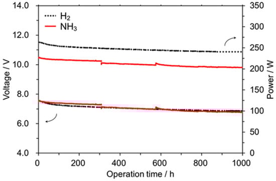 Part of a study by Okanishi et al. [] included a 1000 h stability test for ammonia-fuelled direct SOFCs. The SOFC stack was anode-supported NiO-YSZ|ZrO2-based material|perovskite-type oxide material and was tested at 770 °C with the change in power and voltage monitored when fuelled with ammonia and hydrogen fuel as shown in Figure 7. The stack voltage decreased slightly over time when fuelled with ammonia but was relatively stable when hydrogen was used. Furthermore, the direct H2-fueled SOFC stack maintained a power of at least 235 W during the operation.
