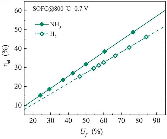 The high operating temperature of SOFCs contributes to their high electrical efficiency []. SOFCs operate at elevated temperatures, eliminating the need for costly platinum group metal catalysts essential for lower-temperature fuel cells. Moreover, the thermal energy from SOFCs can be further utilised in combined cycle systems, achieving efficiencies of 65% or more efficiencies. This is due to the ability of SOFCs to utilise the heat generated during the electrochemical reaction. In summary, the high electrical efficiency of SOFCs and their ability to operate at elevated temperatures and utilise heat in combined cycle plants make them a promising technology for efficient power generation. Bąkała et al. [] conducted a study comparing the electrical efficiencies in an SOFC stack when fuelled by ammonia and hydrogen. The ammonia-fuelled SOFC stack system achieved an electrical efficiency of 55%, higher than that of hydrogen SOFCs, which achieved an electrical efficiency of 47.6% at 680 °C. The literature reported that DA-SOFCs exhibit higher electrical efficiency than SOFCs fed with H2 and equivalent N2/H2 mixture fuels [,,]. For example, Luo et al. [] examined the electrochemical performance of Ni-YSZ|ScSZ|LSM-ScSZ SOFCs under ammonia and hydrogen atmospheres at various temperatures of 600–800 °C. The findings are plotted in Figure 8, and it was revealed that, under a voltage of 0.7 V and Uf = 50%, the DA-SOFC exhibited an electrical efficiency of 32%, which is slightly higher than that of H2-fed SOFCs (27%). When the Uf is increased to 90%, the electrical efficiency is 57% for direct NH3-fed SOFCs, notably greater than that of H2-fuelled SOFCs (49%). The study showed that at equal fuel utilisations, the electrical efficiency of ammonia-fuelled SOFCs was 1.2 times higher than that of the hydrogen-fuelled SOFCs due to the lower gas flow rate of ammonia SOFCs.