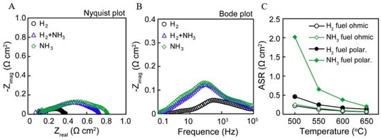 EIS analysis of direct ammonia TF-Ni/YSZ SOFCs under hydrogen, ammonia, and hydrogen-ammonia mixture at 550 °C. Plot (A,B) show the Nyquist and Bode plots with the different fuels, while (C) shows the ohmic and polarisation resistances of the hydrogen and ammonia fuels in temperatures ranging between 500 °C and 650 °C. Reproduced with permission from ref. [].