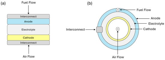 SOFC is a promising technology for power generation due to its high efficiency, low CO2 emissions, long lifetime, and fuel flexibility. A typical SOFC consists of a cathode, anode, and electrolyte, as shown in Figure 1, where fuel would enter the anode, and air would be fed to the cathode. The differences lie between an oxygen ion-conducting electrolyte-based SOFC (O-SOFC) and a proton-conducting electrolyte-based SOFC (H-SOFC). In O-SOFC, the oxygen ions transport from the cathode to the anode to react with hydrogen and produce water. However, in H-SOFC, hydrogen ions transport from the anode to the cathode via the electrolyte to react with oxygen ions to produce water vapour. The electrons are generated through a hydrogen oxidation reaction and then transferred from the anode to the cathode to produce electricity, as shown in Figure 1 and Table 1.
