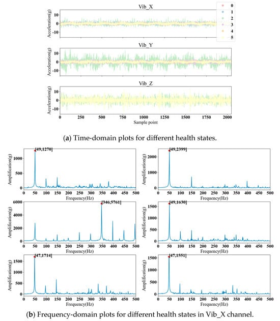 The vibration signals corresponding to the six health states across different channels are shown in Figure 5. It can be observed that the time-domain signals vary under different health conditions, making it challenging to directly identify fault types from these signals. Similarly, in the frequency-domain, although the vibration amplitude is noticeable not only at the fundamental frequency and industrial frequency (6 times the fundamental frequency) but also at other frequencies, it remains difficult to pinpoint specific fault causes based solely on frequency-domain characteristics. To address this challenge, this paper proposes an intelligent fault diagnosis method for vertical centrifugal pumps based on a CNN-BiLSTM architecture.