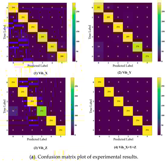 In Figure 7a, the confusion matrix between the true and predicted values during the experiment is shown. Figure 7b shows the box plots of the accuracy, precision, recall, and F1-score results of the model with different channel information, and it can be seen that the vibration signals generated in the Z-direction when the centrifugal pump malfunctions are more complicated, which makes its diagnostic results worse than those of the vibration data in the other two directions, followed by the data in the Y-direction. However, the use of multi-channel information fusion technology can be a good solution to this problem, which shows that the multi-channel information fusion method proposed in this paper can better reflect the fault state of the centrifugal pump.