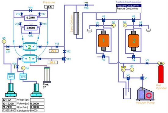 The core of the target reservoir was selected and processed into rock slabs that conformed to the experimental size requirements, ensuring that the proppant could be effectively held within the rock slabs. The 20–40 mesh quartz sand and 30–50 mesh ceramsite proppant were chosen, with a proppant concentration of 10 kg/m2. During the experiment, the closing pressure on the proppant in each period varied within the range of 6–12 MPa. After the flow stabilized, the fracture conductivity at the high closure pressure in each period was tested.