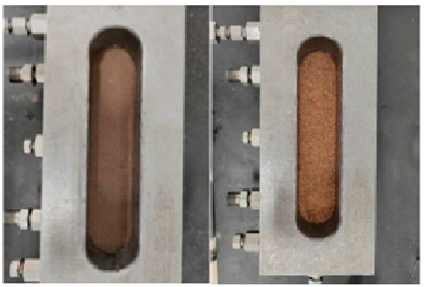 The experiment used the FCES-100 fracture conductivity testing device manufactured by Core Lab in the United States. Figure 1 illustrates the working principle of the device, and Figure 2 shows the pre-laid ceramsite and quartz sand proppants.