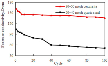 - Compared to the quartz sand, the ceramsite proppant is less affected by the alternating stress, but the fracture conductivity can be maintained at a high level. Under the same secondary cushion gas, the gas production rate of the ceramsite proppant is significantly higher than the quartz sand proppant. Therefore, the 30–50 mesh ceramsite is recommended as the preferred choice.