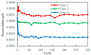 By fitting the experimental data of core 3 using the power function on permeability under multi-period injection and production alternating stress, a quantitative relationship between formation permeability and cycles was established, providing essential data for evaluating the effectiveness of injection and production processes. This equation was applicable for describing the variation of permeability within the same reservoir.