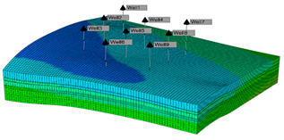 The duration of the cycle and the pressure were set according to the on-site injection–production system, and the fractures were set according to the on-site fracturing. During the simulation, the nine wells collectively contained 10 million cubic meters of cushion gas in the early stage, and each well was injected at a rate of 2200 m3/h during the gas cushion period. After the gas cushion phase concluded, the injection–production cycle commenced, with each cycle consisting of 8 h of gas injection and 4 h of gas production. During gas injection, the injection bottomhole pressure was maintained at 16.5 MPa, while the production bottomhole pressure was set to 12.5 MPa during gas production (as shown in Table 2). The simulation used the CMG restart function, where the injection–production states prior to the onset of stress sensitivity were utilized as the initial conditions for late stress sensitivity calculations.