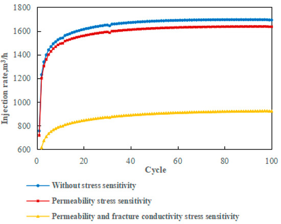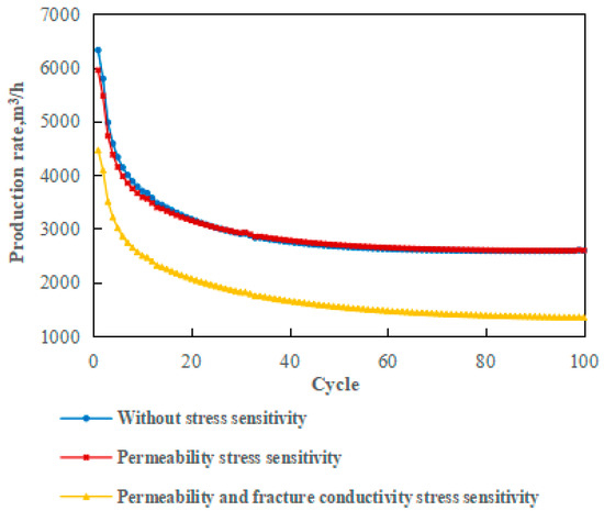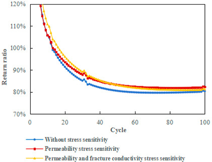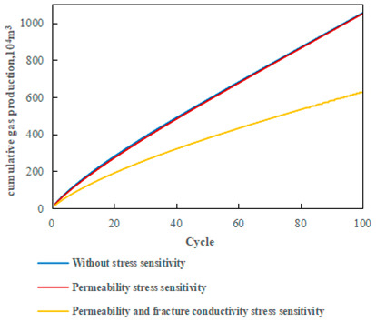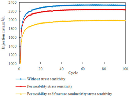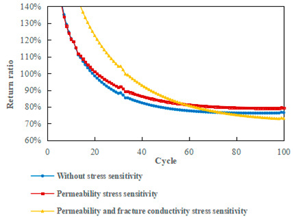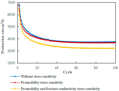 - The multi-cycle stress sensitivity effect on reservoir permeability and fracture conductivity can result in a suboptimal injection–production performance, with the impact on permeability being relatively minor.