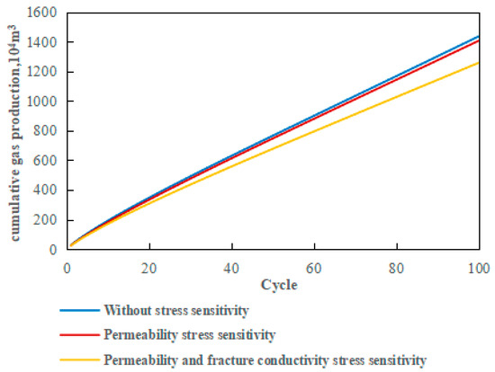As shown in Figure 6 and Figure 7, when ceramsite proppant was used, the following observations can be made: If only permeability change was considered, the gas accumulation effect of the reservoir was enhanced due to reduced permeability, leading to an increased return ratio. However, the cumulative gas production decreased by 2.06%. When both permeability changes and fracture conductivity changes were taken into account during the first 50 cycles, the gas accumulation effect remained strong due to decreased permeability. If the changes in permeability and fracture conductivity were considered at the same time in the first 50 cycles, the gas accumulation effect of the reservoir was enhanced due to the decrease in permeability. Subsequently, owing to the sufficient cushion gas energy, the reservoir pressure remained higher, resulting in a return ratio that exceeded the scenario where only permeability changes were considered. After 50 cycles, however, the combined effects of reduced permeability and reduced cushion gas energy led to a lower return ratio, compared to the case where only permeability change was considered. Additionally, the cumulative gas production was 12.41% lower than in the scenario without stress sensitivity.