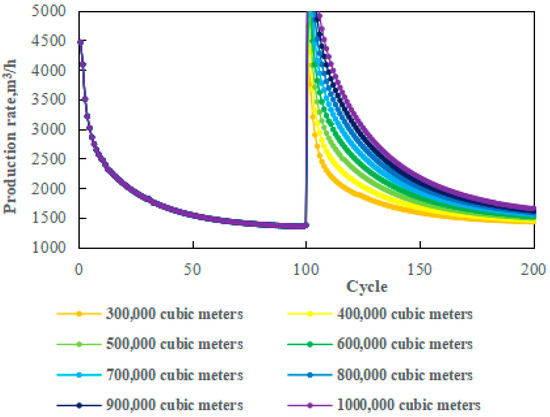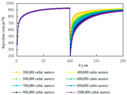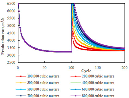 After stress sensitivity occurred, the gas production rate decreased significantly. To enhance the gas production rate and meet production demands, a secondary cushion gas was required. After 100 cycles, simulations were conducted to analyze the change in gas production rates and the short-term adjustment of injection pressure. These simulations utilized a secondary gas cushion composed of 30–50 mesh ceramsite (ranging from 100,000 to 800,000 m3) and 20–40 mesh quartz sand (ranging from 300,000 to 1,000,000 m3).