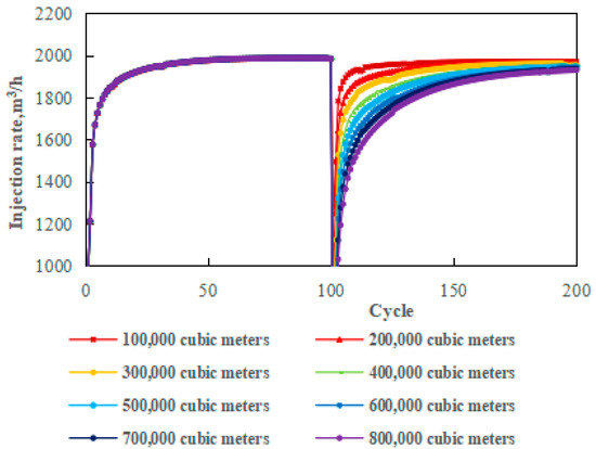 As shown in Figure 12 and Figure 17, when stress sensitivity was neglected, the gas production rate stabilized at approximately 2600 m3/h after 100 cycles. When permeability and fracture conductivity stress sensitivity were considered, the secondary gas cushion had to exceed 800,000 cubic meters to maintain the gas production rate of over 2600 m3/h within the first 30 cycles after the gas cushion. In comparison with the ceramsite proppant, quartz sand exhibited greater susceptibility to alternating closure stress, leading to more severe crushing and embedment during the injection and production process. Consequently, given the same volume of secondary gas, the gas production rate of quartz sand did not surpass that of the ceramsite proppant, nor did it remain stable for as long a duration. The secondary gas cushion can only sustain the gas production rate for a limited time, after which the gas production rate will continue to decline during the subsequent injection and production process. As shown in Figure 18, the gas injection rate of quartz sand was consistently lower than that of the ceramsite proppant.