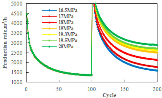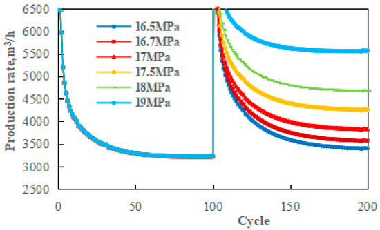 As shown in Figure 16 and Table 5, following the simulation of the 500,000 cubic meter secondary gas cushion in a single well, the gas production rate varied under different injection pressures (ranging from 16.5 to 19 MPa). When stress sensitivity was disregarded, the gas production rate stabilized at approximately 3700 m3/h after 100 injection–production cycles. After the occurrence of the cyclic stress sensitivity effect, in order to achieve a production rate of 3700 m3/h, the gas injection pressure had to be increased to at least 17 MPa.
